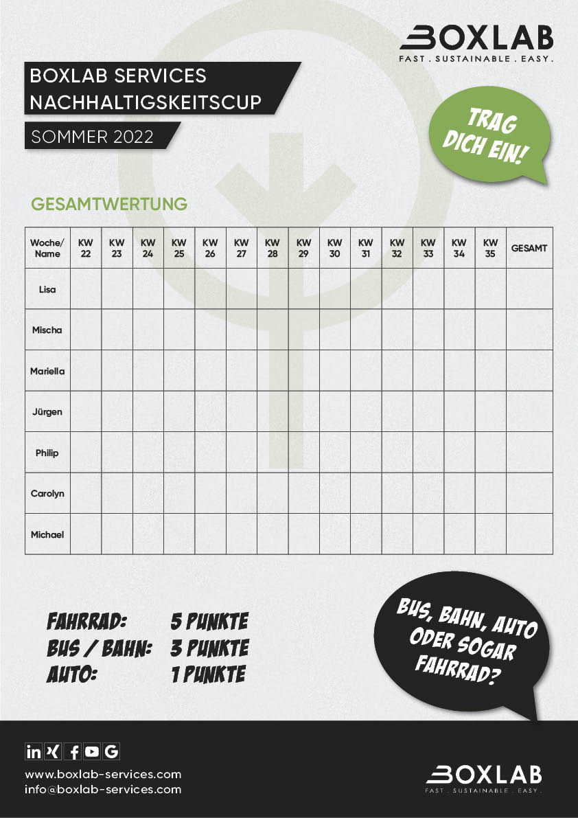 So motiviert wir auch sind, unseren Alltag so nachhaltig wie möglich zu gestalten, so realistisch sind wir auch. Wir wissen, dass das Auto morgens bei Regen oder wenn man die ersten zwei Wecker überhört, doch zu verlockend sein kann. Deshalb veranstalten wir im Zeitraum der Gültigkeit des 9-Euro-Tickets den BOXLAB Nachhaltigkeitscup 2022.