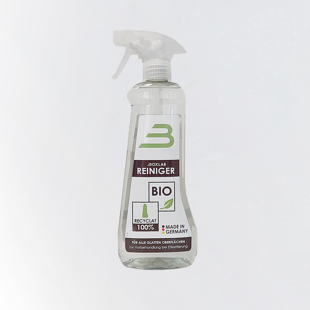 Der BOXLAB BIO-Reiniger unterstreicht nicht nur die Effizienz, sondern auch die Umweltfreundlichkeit von BOXLAB Services. Die Flasche des Reinigers besteht komplett aus Recyclat, was den nachhaltigen Ansatz des Unternehmens unterstreicht. Hergestellt in Deutschland, bietet der Reiniger nicht nur optimale Reinigungseigenschaften, sondern setzt auch auf umweltfreundliche Materialien.