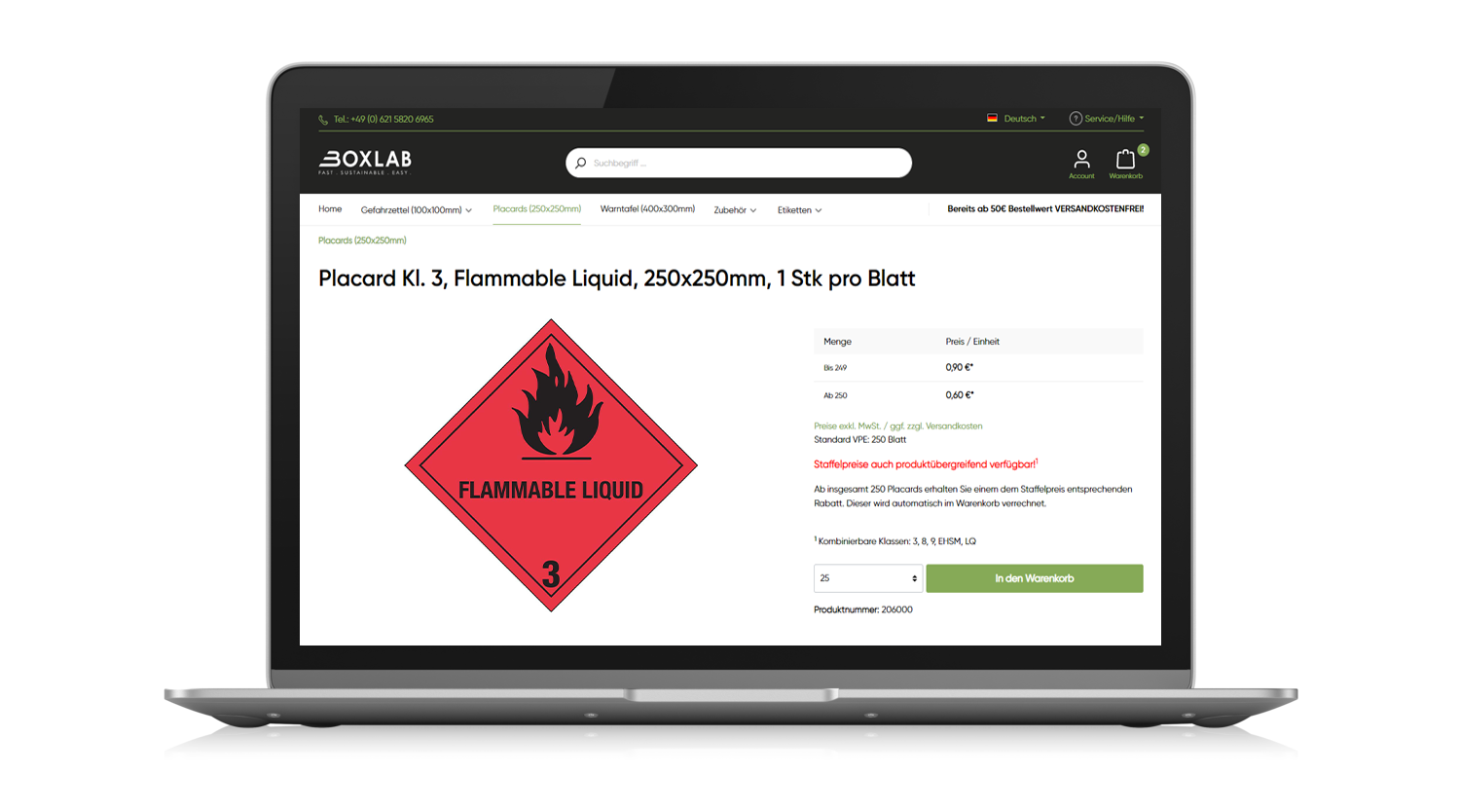 The function is currently in an extended test phase and is already available to our customers for the most common combinations of placards. „By having already enabled the feature for hazard classes 3, 8, 9, as well as for placards EHSM and LQ, our customers already benefit from the cross-product scale price for most orders, as these items are often needed and purchased in combination,“ explains Lisa Ruffing, COO of BOXLAB Services. „In addition, compared to many other providers, we offer a large number of individual articles, because with us each UN number has its own article number, so the customer not only sees a preview image directly for each UN number, but we also expand the flexibility in ordering many times over,“ adds Mischa Feig, CEO of BOXLAB Services.