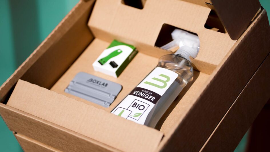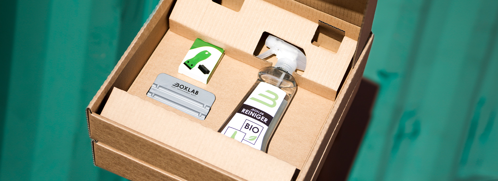 Unsere Systemlösung Placards besteht aus insgesamt vier Bestandteilen. Dazu gehören neben unseren bewährten BOXLAB Placards mit cleverer Abziehlasche auch unser BOXLAB BIO-Reiniger, ein Rakel und der praktische und gefährdungsfreier Plastikschaber zum kinderleichten Entfernen alter Placards.