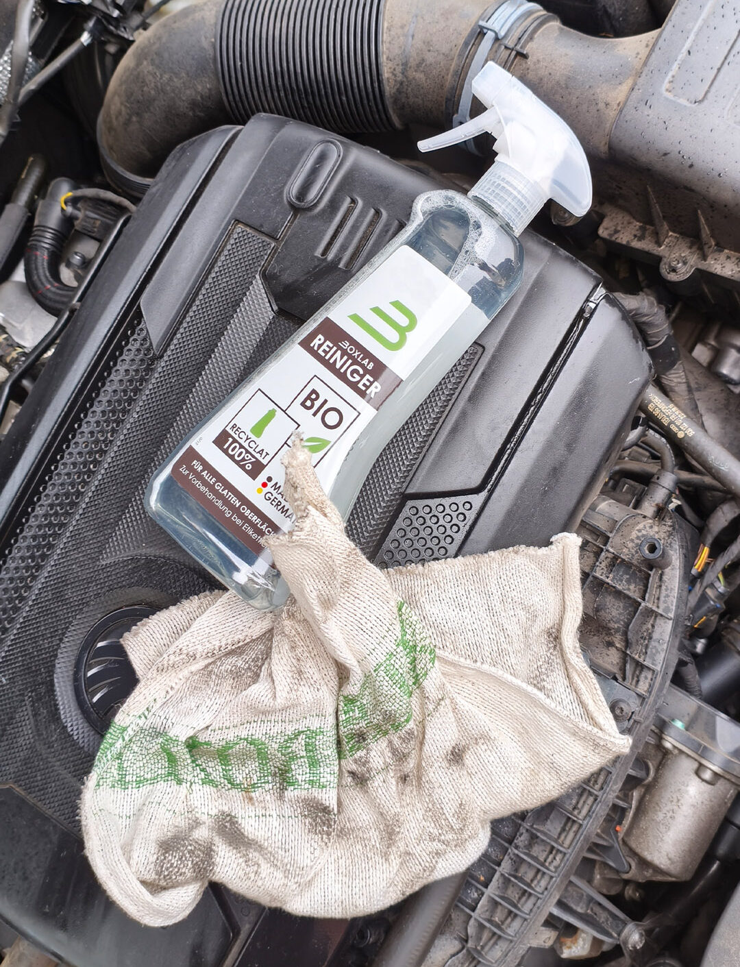Das Bild zeigt den BOXLAB BIO-Reiniger zusammen mit einem BOXLAB Maschinenputztuch im Motorraum eines Fahrzeugs. Das Tuch liegt auf einer verschmutzten Oberfläche und verdeutlicht die effektive Reinigung von öligen und schmutzigen Bereichen. Durch die Kombination aus hochwertigem Maschinenputztuch und dem BOXLAB BIO-Reiniger lassen sich Motorraum und andere schwierige Oberflächen schnell und gründlich säubern, um eine ideale Grundlage für Etikettierungen oder weitere Reinigungsprozesse zu schaffen.